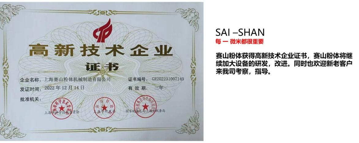 ac米兰官网粉体获得高新技术企业证书,ac米兰官网粉体将继续加大设备的研发,改进。同时也欢迎新老客户来我司考察,指导。
