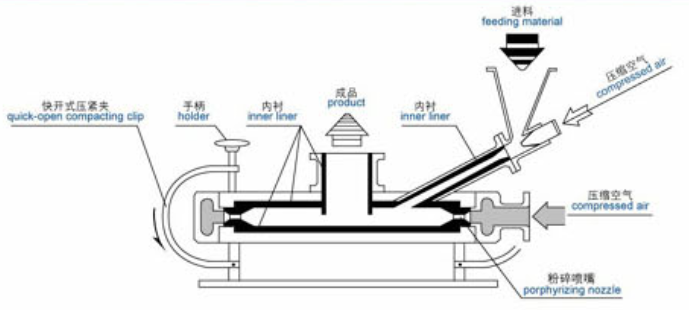 均匀喂料通过均匀进料器向气流粉碎主机给料,并控制进料速度粉碎由连接在给料器上的文丘管吸入粉碎主机内部,粉碎腔压力气体和物料同时进入粉碎机,物料被高速气流粉碎带动,发生高速碰撞,产生粉碎效果。压缩空气伴随成品进入旋风分离器,气固分离气粉混和物高速进入上部圆筒体,粉料因质量大向下旋转运动至下出口质量小向上旋出,气固实现分离尾气过滤进入的气体中夹带少量的粉尘被过滤筒(袋)阻隔。含尘气体被过滤成洁净气体比较后从风机出口排出,气固彻底分离。